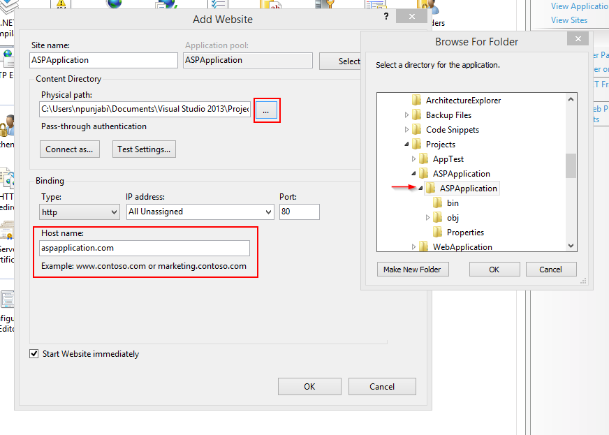 Enter Site name, Select appropriate Physical path of the website, be careful in selecting the project folder, Enter Host Name (Host name will be the URL of which you will be able to access application).