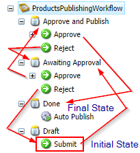 Similarly from Approve and Publish state Approve Command will point the Next state as Done and Reject Command will point the Next State to Awaiting Approval State.